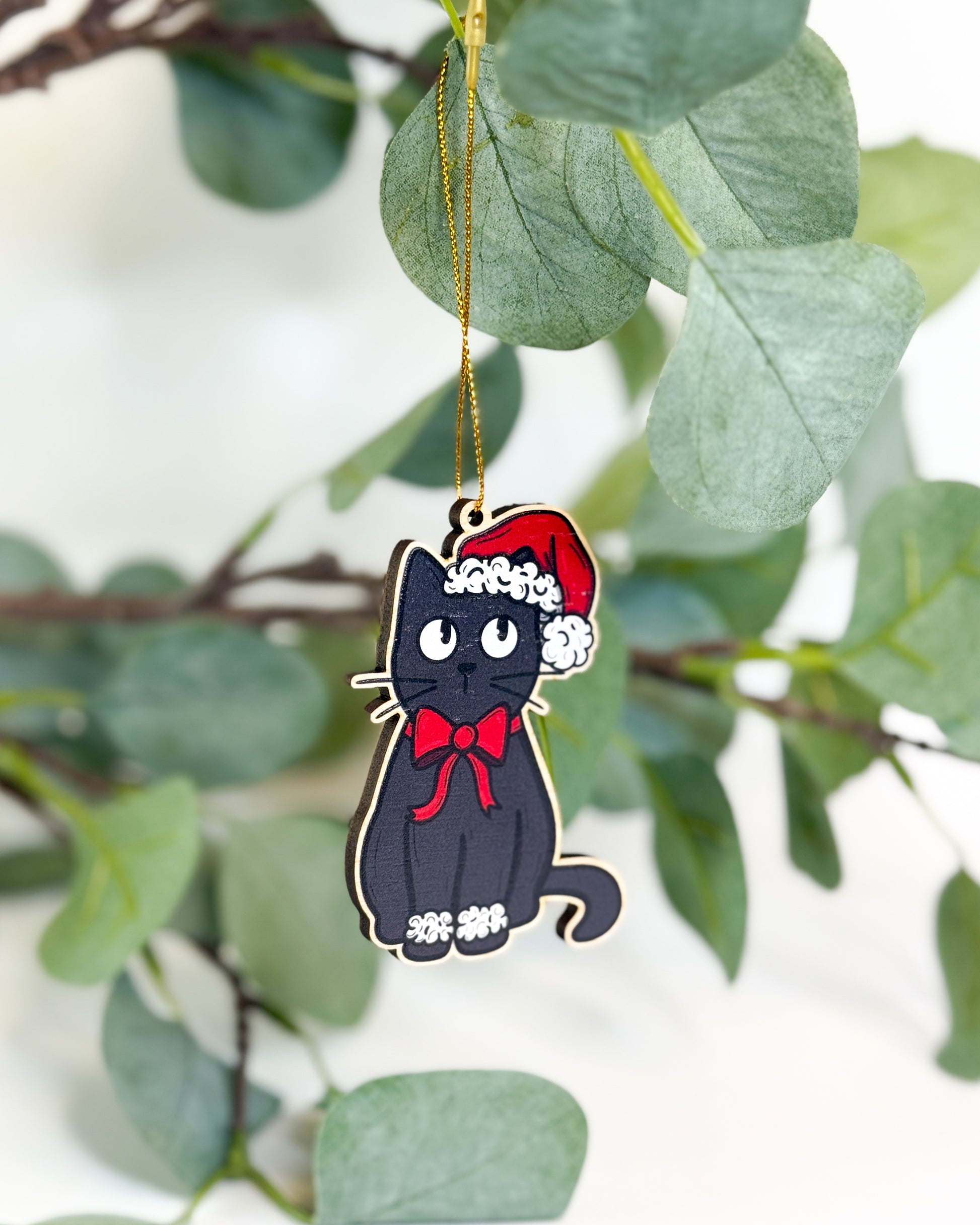 CHRISTMAS HAT BLACK CAT WOODEN CHRISTMAS TREE DECORATION